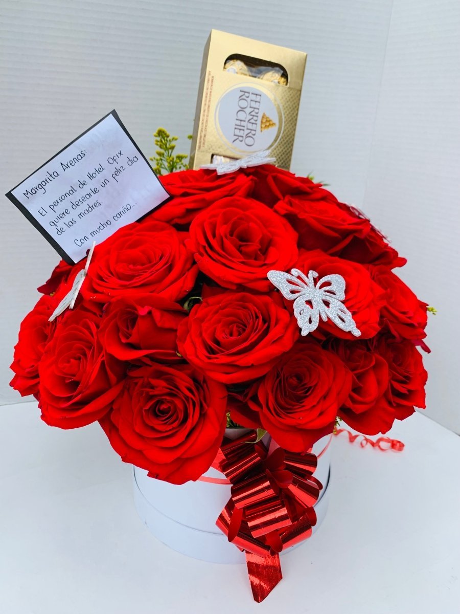 Este hermoso bouquet contiene 24 rosas de alta calidad y 8 deliciosos Ferrero Rocher, perfecto para expresar amor, amistad y agradecimiento. El bouquet está decorado con cuidado y elegancia para añadir un toque especial a cualquier ocasión. Sorprende a tus seres queridos con este regalo único y significativo.